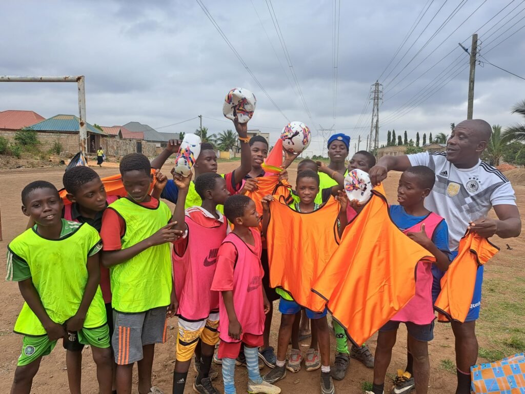 Our foundation recently enhanced its football training program by acquiring cones and bibs, and through the support of Mr. Benedict Owusu, received four footballs from the Ghana Football Association(GFA). These items were carefully selected based on the practical needs of our coaching staff and were handed over directly to our lead coach, who oversees day to day training with our youth teams